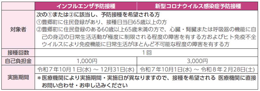 豊郷町では、高齢者のインフルエンザおよび新型コロナウイルス感染症の発症予防や重症化予防を主な目的として、定期予防接種を下記のとおり実施しています。