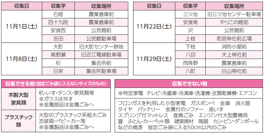 当日、8時00分までに各収集場所へお出しください。前日からは出さないでください。回収した粗大ごみはリユースのため販売・譲渡する場合があります。