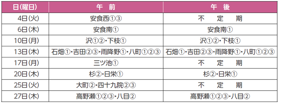 ※集落名の後にある○印の数字は、お申込みいただいた収集回数を表しています。(1)は1ヶ月に1回、(2)は2ヶ月に1回、(3)は3ヶ月に1回でのお申込みを表し、「安食西(1)」とある場合は1ヶ月に1回で申込みいただいた安食西のお宅を収集させていただきます。なお、収集予定のない集落等については、翌月以降の収集となります。