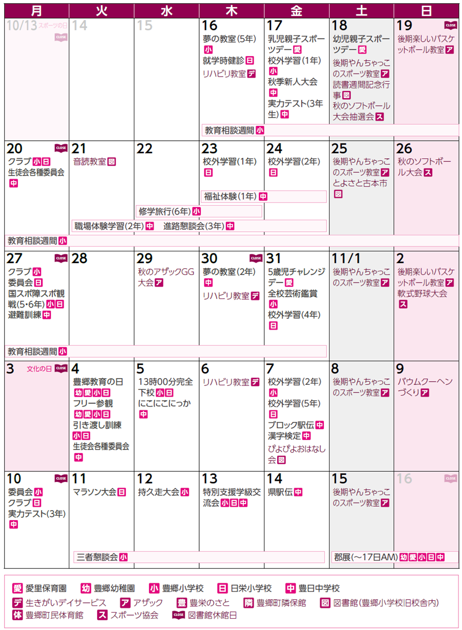 くらし とよさとカレンダー 25/31 前の記事 次の記事 発行日 : 2025年10月10日 自治体名 : 滋賀県豊郷町 広報紙名 : 広報とよさと 2025年10月号 ■10月16日〜11月15日の行事をお知らせします ※崇徳保育園の予定については、園からのおたよりや配信アプリでのお知らせとなります。 Tweet シェアする 乳幼児健診10月・11月分 第5回 フロアーコンサート 冬の日コンサート
