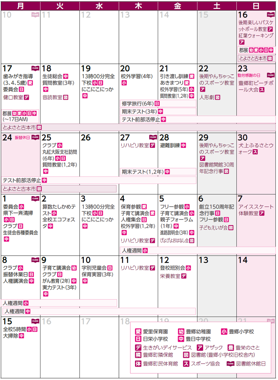 くらし とよさとカレンダー 18/23 前の記事 次の記事 発行日 : 2025年11月14日 自治体名 : 滋賀県豊郷町 広報紙名 : 広報とよさと 2025年11月号 ■11月16日〜12月15日の行事をお知らせします ※崇徳保育園の予定については、園からのおたよりや配信アプリでのお知らせとなります。 Tweet シェアする 乳幼児健診 11月・12月分 豊郷小学校旧校舎群ライトアップandイルミネーション点灯式