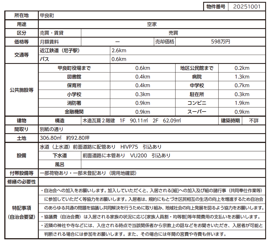当町の空家・空地バンク情報登録制度では物件のある地区に最初に回覧させていただいておりますので、広報誌発行時点で売却契約が成立している場合があります。