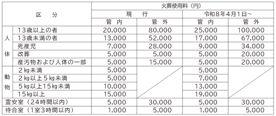 紫雲苑では、近年の燃料費高騰や火葬炉設備の修繕費等の増加が見込まれることから、将来にわたる業務の安定的な継続と、利用者への適正な負担の確保を目的として、令和8年4月1日より使用料を変更します。