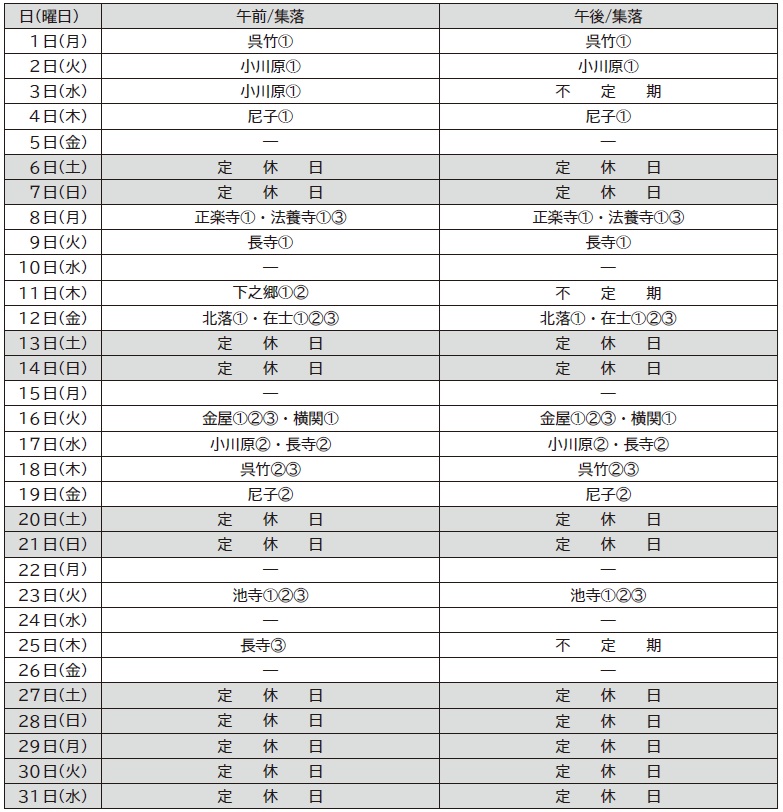 ※集落名の後にある○印の数字は、お申込みいただいた収集回数を表しています。(1)は1か月に1回、(2)は2か月に1回、(3)は3か月に1回でのお申込みを表し、「呉竹(1)」とある場合は1か月に1回で申込みいただいた呉竹のお宅を収集させていただきます。なお、収集予定のない集落等については、翌月以降の収集となります。