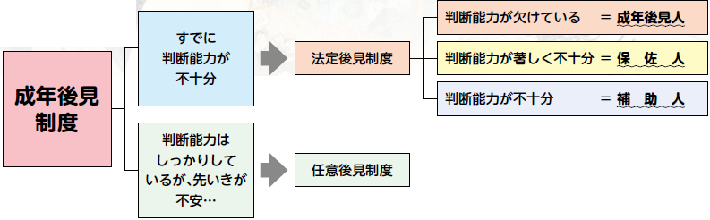 また、自分に不利益な契約であっても判断ができずに契約を結んでしまい、悪質商法の被害にあう恐れもあります。このような、判断能力の不十分な方々を保護し、支援するのが成年後見制度です。大きく分けると法定後見制度と任意後見制度の二つの制度があります。