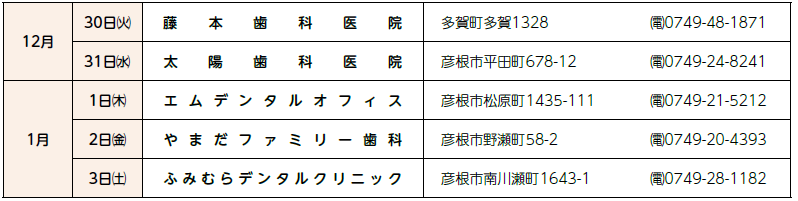 くらし 年末年始の救急歯科診療について 25/38 前の記事 次の記事 発行日 : 2025年12月05日 自治体名 : 滋賀県多賀町 広報紙名 : 広報たが 2025年12月号 年末年始の救急歯科診療を下記の診療所でおこないます。(診療時間は、9:00~15:30) →福祉保健課 【有】2-2021【電話】0749-48-8115【FAX】0749-48-8143 Tweet シェアする 初詣交通規制のお知らせ 年末年始の搬入受付のお知らせ