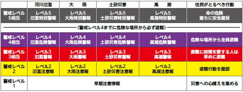 河川氾濫、大雨、土砂災害、高潮に関する情報は、これまで警戒レベルとの対応が複雑でわかりにくくなっていましたが、今回の改善により、避難情報の5段階の警戒レベルに対応し、避難の判断をしやすくなります。