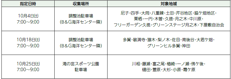 粗大ごみ収集を次のとおり実施します。雨天決行ですが、収集日当日の6時に警報が発令されている場合は中止します。中止の連絡は有線放送、ホームページ、多賀町総合情報配信メールでお知らせいたします。