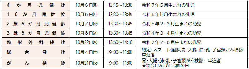 ・整形外科健診、4か月児健診、10か月児健診を受ける方は、バスタオルをご持参ください。