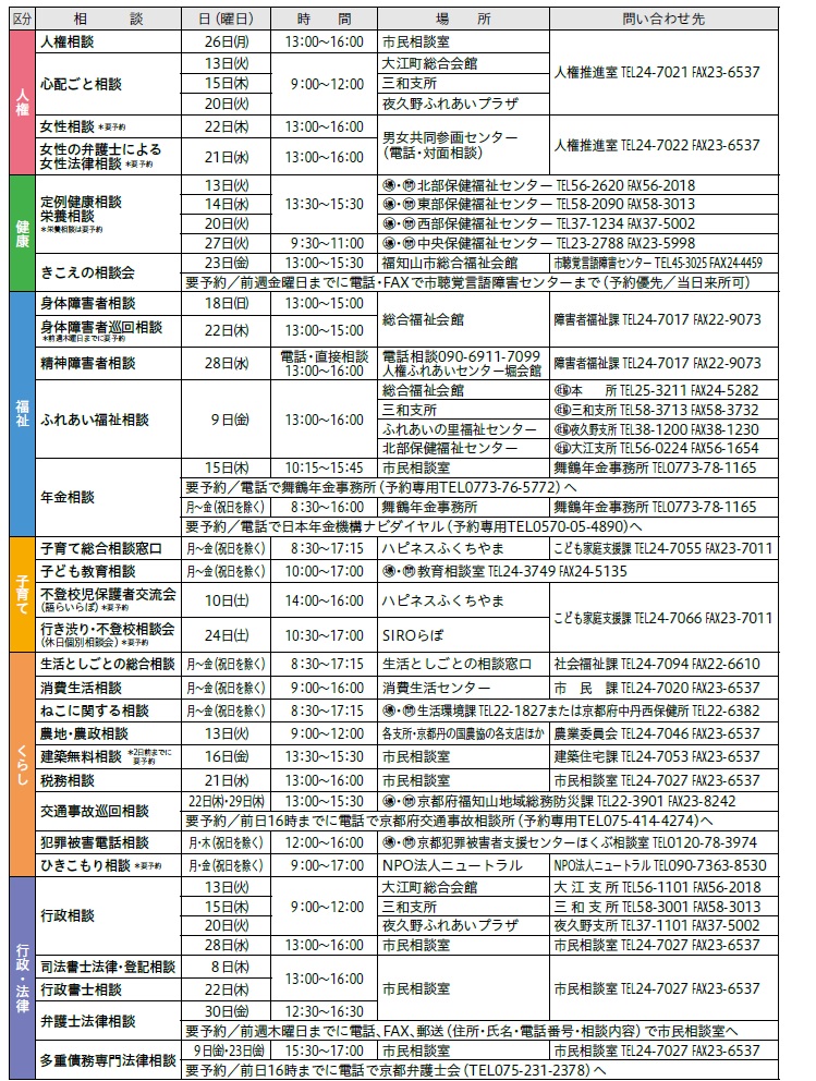 くらし 1月・相談あんない 26/34 前の記事 次の記事 発行日 : 2025年12月04日 自治体名 : 京都府福知山市 広報紙名 : 広報ふくちやま 2025年12月号 *いずれも無料・秘密厳守。特記した相談以外は、事前の申し込みは不要です。 *申込日が祝日の場合は、その前日まで。 略記号の説明:場…場所、問…問い合わせ先、社協…社会福祉協議会 Tweet シェアする 休日当番医(1月) ミミちゃんとコロちゃんの図書館情報局