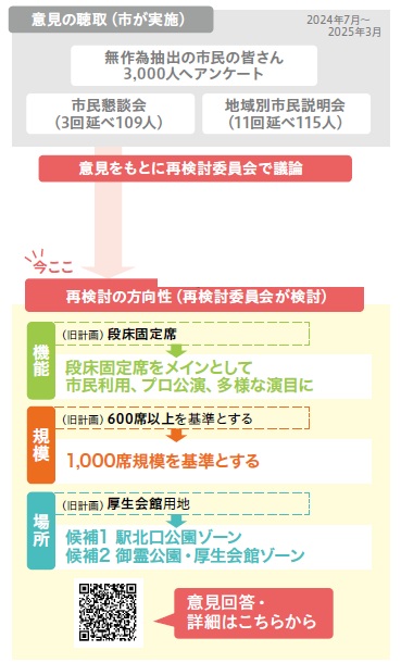 福知山市は2023年7月に「福知山市新文化ホール基本計画」を策定しましたが、この基本計画に対して多くのご意見がありました。新文化ホールは、できるだけ多くの市民の皆さんの理解を得て整備を進めることが大切であると考え、市民のみで組織する委員会で基本計画を再検討することとしました。