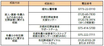 犯罪被害は、いつ誰に起こるかわかりません。突然、犯罪の被害に遭われた人やその家族は、犯罪による直接的な被害だけでなく、精神的・経済的負担など様々な困難に直面します。困難から立ち直り、安心して平穏な生活を送るためには、まわりの皆さんの理解と協力が必要です。福知山市では、京都犯罪被害者支援センターほくぶ相談室や福知山警察署と連携し、犯罪に遭われた人やその家族が平穏な生活を取り戻すための支援と犯罪被害者支援に関する啓発を行っています。