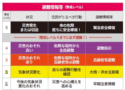 避難のお知らせは市から防災行政無線・防災アプリなどで行います。最新の情報に注意を払い、左図を参考に避難行動を取ってください。