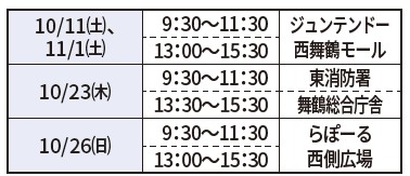 10/13(祝)・26(日)、11/9(日) まいづる薬局国立前(倉梯町、【電話】65-1188)