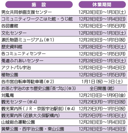 ※2…JR六地蔵駅前第2自転車等駐車場、JR宇治駅南自転車等駐車場、近鉄小倉駅西第1自転車等駐車場は1月1日(祝)~3日(土)も利用可能(JR六地蔵駅前第2自転車等駐車場は定期利用のみ)
