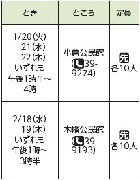 申込み:1月16日(金)午前9時~2月18日(水)に、電話か同センター窓口へ。