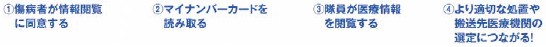 マイナ保険証(健康保険証として利用登録したマイナンバーカード)を活用し、救急隊員が医療情報(病歴や処方薬など)を閲覧する仕組みのことです。医療情報は、適切な応急処置の実施、搬送病院の迅速な決定のために活用します。