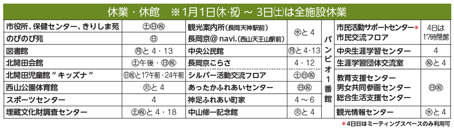 くらし 市民無料相談/定期開催/休業・休館 30/37 前の記事 次の記事 発行日 : 2026年01月01日 自治体名 : 京都府長岡京市 広報紙名 : 広報長岡京 2026年1月号 Tweet シェアする (日)(祝)(休)の急患は 公共施設の予約や確認