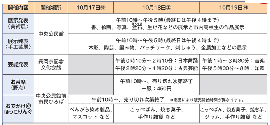 市内最大の文化イベントが今年も開催!多彩な作品や舞台芸術のほかに、お茶席やお菓子の販売もあります。ぜひご参加ください。