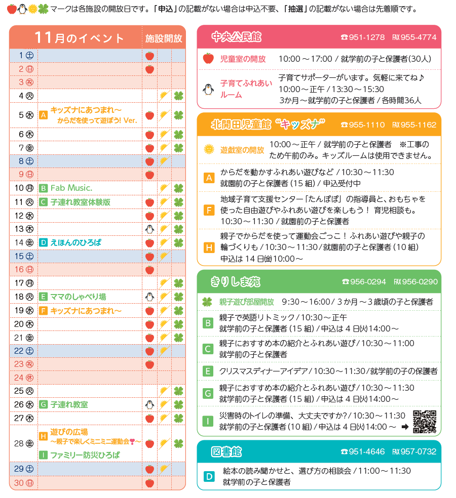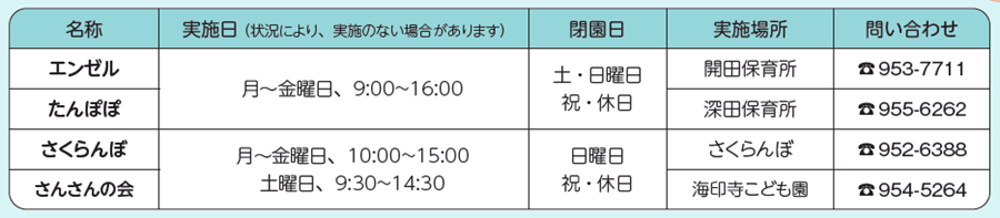 遊びの場の提供や育児相談など、就園前の子と保護者が利用できます。事前予約の有無など、詳細は各センターにお問い合わせください。