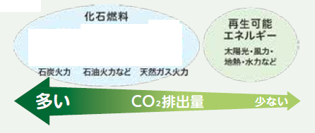 電力発電には、化石燃料(石炭・石油・天然ガスなど)、原子力、再生可能エネルギー(太陽光・風力・水力など)があり、発電する際に排出されるCO2の量が少ないほど、環境に配慮された電気といえます(下図参照)。