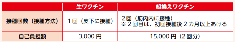 内容:下表のとおり。帯状疱疹ワクチンは、生ワクチンと組換えワクチンの2種類があります。接種回数や接種方法などが異なりますので、医師と相談して接種してください。