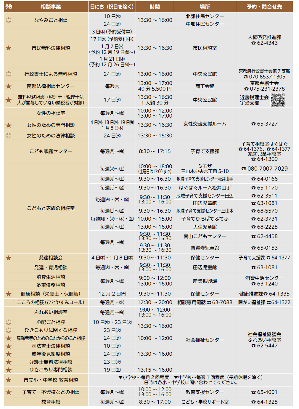 くらし 相談窓口 12月 31/43 前の記事 次の記事 発行日 : 2025年12月01日 自治体名 : 京都府京田辺市 広報紙名 : ほっと京たなべ 令和7年12月号(No.955) 12月1日~令和8年1月10日分を掲載しています。 年末年始の休業日は各施設に問い合わせるか、本紙32ページをご覧ください。 記載がないものは無料/★は事前予約制/◎は予約が優先 Tweet シェアする 図書館だより 12月 京たなべde子育て(1)