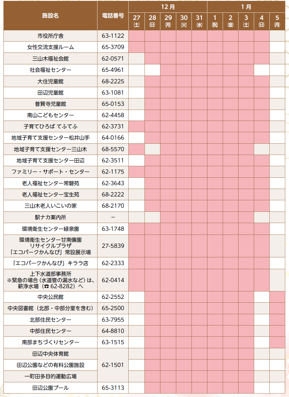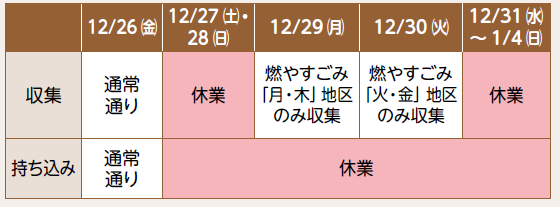 年末年始のごみ収集・持ち込みごみの受け付けは、下表のとおりです。年末は収集時間が通常と異なる場合があります。ごみは、収集日の午前9時までに決められた場所に出してください。