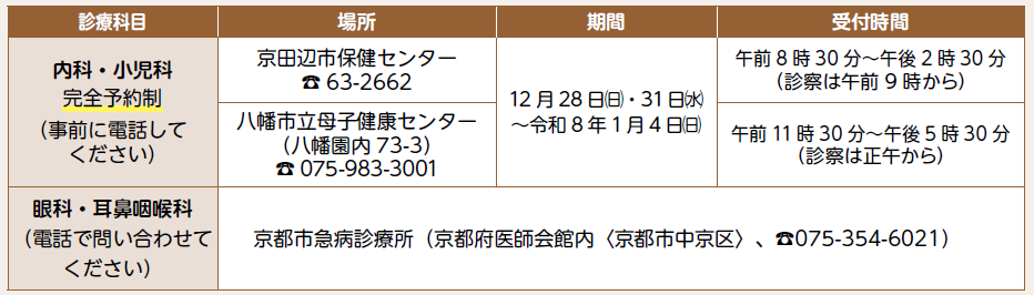 市は、休日に発病した時に応急医療が受けられるよう、休日応急診療所(下表参照)を開設しています。