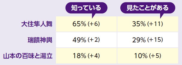 市指定無形民俗文化財をテーマに、2年ぶりに市民の皆さんにLINEアンケートを行いました。323人の回答者のデータと意見の一部を紹介します。詳しくは、市ホームページをご覧ください。