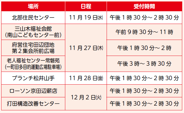 地域巡回は当日受け付けできますが、時間がかかる場合がありますので、できるだけ事前に申し込んでください。