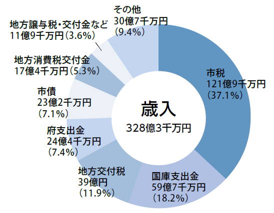 歳入総額は328億3千万円で、市債・国庫支出金などが減少したため前年度より12億2千万円減少しました。また、歳入で最も大きな割合を占める市税は、7千万円増加し、121億9千万円でした。一方で、市債は13億6千万円減少し、23億2千万円でした。これは、建設事業費が減少したためです。