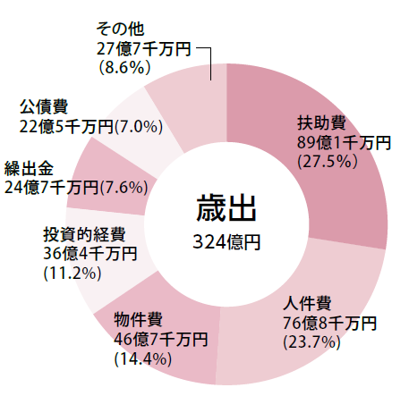 歳出総額は324億円で、前年度より13億5千万円減少しました。これは、定額減税調整給付などにより増加した経費がある一方、中学校給食施設の整備完了などに伴い、投資的経費が減少したことによるものです。