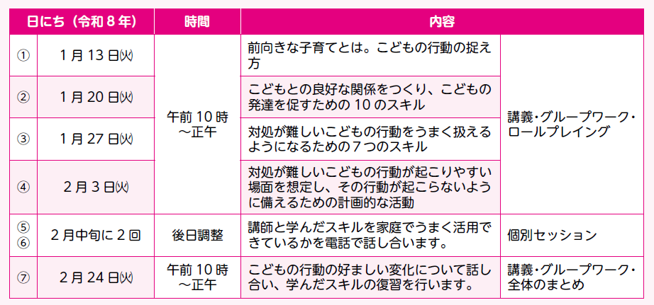 こどもの生きる力を育み、前向きに子育てするヒントや具体的な子育て技術「トリプルP」を学びます。トリプルPはオーストラリアで開発された親向けの子育て支援プログラムです。おおむね2~12歳のこどもと保護者に焦点を当てています。託児(生後6カ月~おおむね2歳)があります。