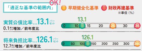 実質公債費比率は、公債費にかかる普通交付税算入額が減少したため、前年度より0.1ポイント増え13.1パーセント(3カ年平均)、将来負担比率は、地方債現在高の増加および充当可能基金が減少したことから前年度より12.7ポイント増え126.1パーセントとなりました。