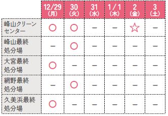 年末年始の12月31日から1月3日まで、各地区のごみステーションでの収集は行いません。また、1月2日午前中のみ峰山クリーンセンターを臨時開設しますので、直接持ち込みが可能です。
