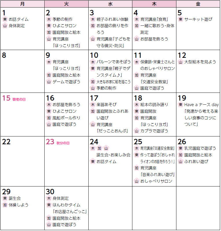 ※下記のイベント時間は、(木)…午前10時~正午、(東)(加)(山)…午前9時30分~正午です。