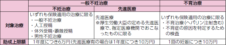 対象治療内容と助成限度額:本人負担額の合計の2分の1以内で助成。