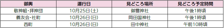 江戸時代から続く伝統行事である市指定文化財「木津御輿太鼓祭」を運行します。見どころは神社の境内で御輿を高く担ぎ上げる「拝殿廻り」です。