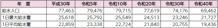 給水人口は、人口増加に併せて増加傾向にありましたが、令和4年度の79,974人をピークに減少傾向に転じています。また、給水量も給水人口の減少や節水機器の普及などから同じく減少傾向にあり、令和40年には給水人口69,462人、1日最大給水量21,727立方メートル、1日平均給水量が19,436立方メートルまで減少することが予測されます。