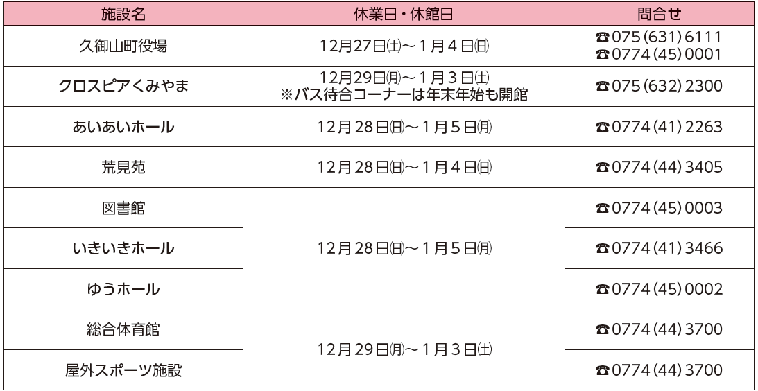 くらし 年末年始の公共施設の休み 1/8 次の記事 発行日 : 2025年12月15日 自治体名 : 京都府久御山町 広報紙名 : まちの総合情報紙 広報くみやま お知らせ版 令和7年12月15日号 No.1181 Tweet シェアする 年末年始のごみ収集・し尿収集