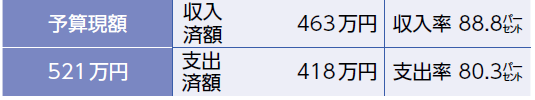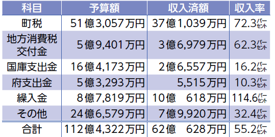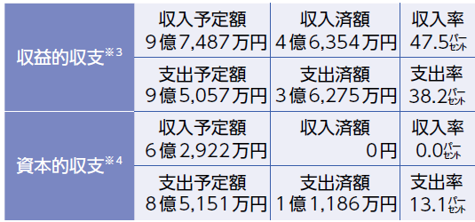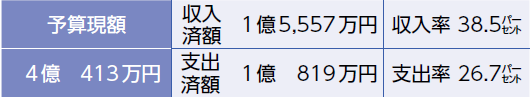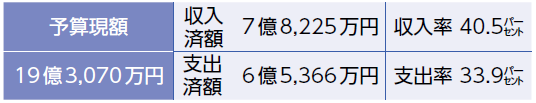 歳入の収入済額は62億628万円(収入率55.2パーセント)、歳出の支出済額は36億3,613万円(支出率32.3パーセント)です。