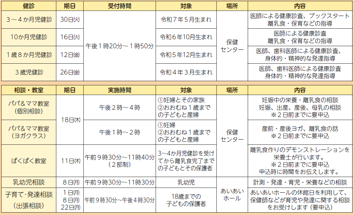 子育て 9月の健診・相談・教室 27/35 前の記事 次の記事 発行日 : 2025年09月01日 自治体名 : 京都府久御山町 広報紙名 : まちの総合情報紙 広報くみやま 令和7年9月1日号 No.1174 ※母子(親子)健康手帳を必ずお持ちください ※乳幼児相談以外の「相談・教室」は予約制としています。 問合せ:子育て支援課 Tweet シェアする 9月相談 みんなのひろば
