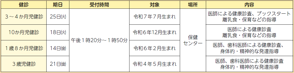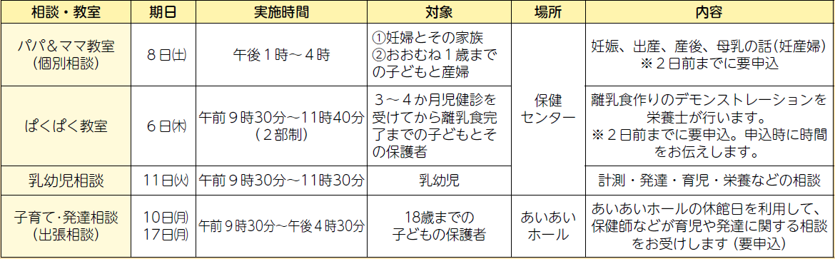 子育て 11月の健診・相談・教室 28/36 前の記事 次の記事 発行日 : 2025年11月01日 自治体名 : 京都府久御山町 広報紙名 : まちの総合情報紙 広報くみやま 令和7年11月1日号 No.1178 ※母子(親子)健康手帳を必ずお持ちください ※乳幼児相談以外の「相談・教室」は予約制としています。 問合せ:子育て支援課 Tweet シェアする 11月相談 TOPIC