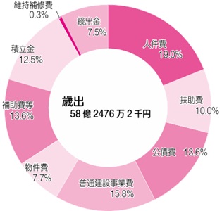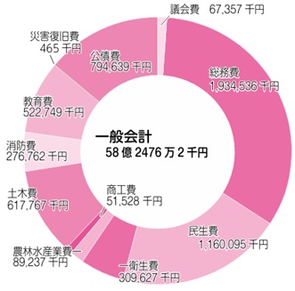 歳出は58億2476万2千円で、前年度より15億6420万4千円(21.2%)の減となりました。主な支出は次のとおりです。