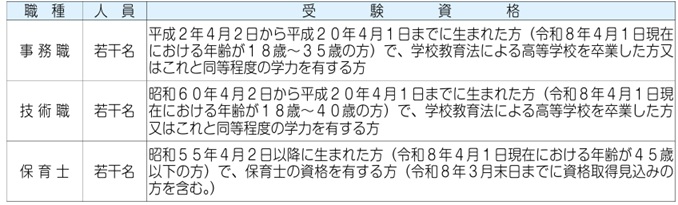 ・「事務職」は35歳まで、「技術職」は40歳まで、「保育士」は45歳まで受験可能。