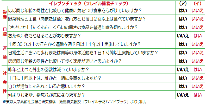 (イ)の欄に5つ以上当てはまる人はフレイルの可能性があります。予防方法を学びましょう。