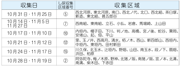 ・刈草も透明または半透明の袋で出してください。刈枝は長さ50cm以下、太さ5cm以下にして、ひもで束ねて燃やすごみの日に出してください。ダンボール、紙袋等の中身が見えない袋では出さないでください。