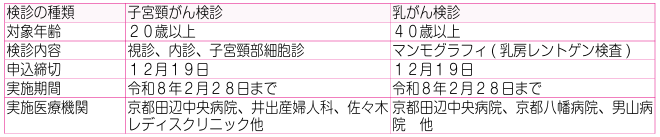 井手町では2年に1回、20歳以上の女性に子宮頸がん検診、40歳以上の女性に乳がん検診を実施しています。
