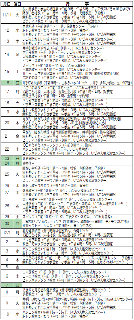 くらし まちのカレンダー(11月11日~12月10日) 35/36 前の記事 次の記事 発行日 : 2025年11月10日 自治体名 : 京都府井手町 広報紙名 : 広報いで 令和7年11月号 No.638 Tweet シェアする ごみ収集日程表(11月11日~12月) その他のお知らせ(広報いで 令和7年11月号 No.638)